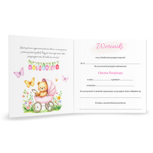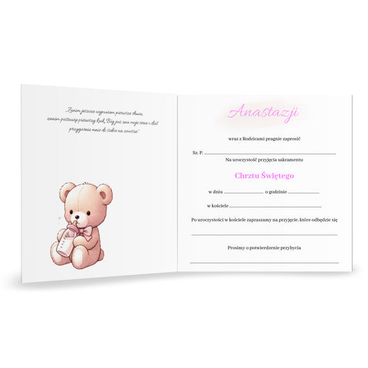 Zaproszenie składane z kopertą na Chrzest - Pluszowy miś z różowymi balonami