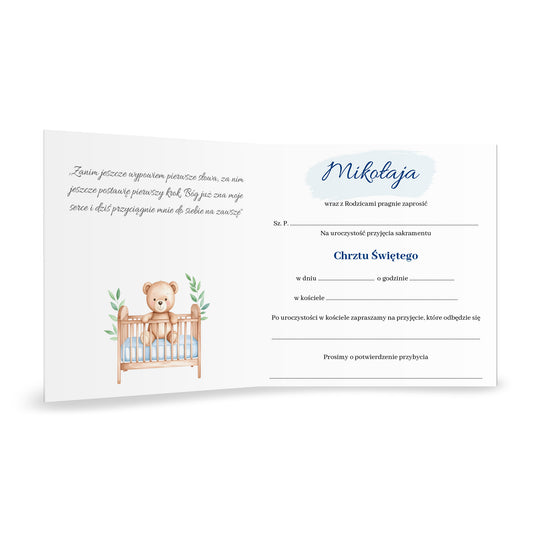 Zaproszenie składane z kopertą na Chrzest - Pluszowy miś i niebieskie motyle