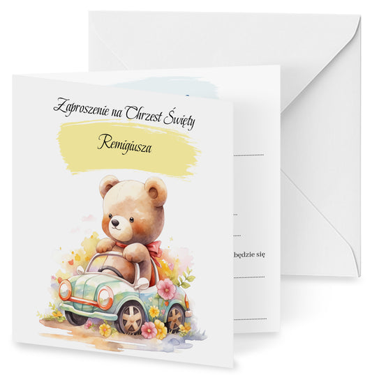 Zaproszenie składane z kopertą na Chrzest - Pluszowy miś samochodzik