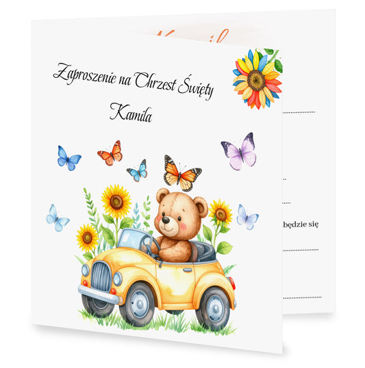 Zaproszenie składane z kopertą na Chrzest - Pluszowy miś w żółtym samochodzie